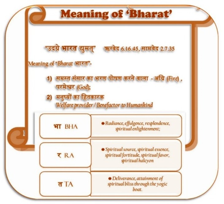 The Veda literally means “Absolute Consciousness” or “Knowledge” and Bharata means—‘Bha’ भा means “light and Knowledge”, and ‘rata’ रत means “attached or devoted to”; i.e. reference to one who is illumined, i.e., who has attained cosmic consciousness, realization of the absolute. Bharata means devoted to light as against darkness. So Bharata is not the name of a mere geographical entity placed in some corner of the world and having its geographical, topographical, and other limitations. Bharata stands for every individual soul that has this idea of light, the dedication to the light, as against immersion in darkness1.